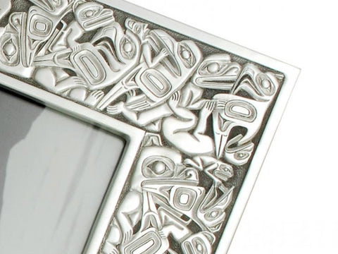 The rim of this pewter frame is carved with a West Coast design known as panel pipe. It is based on the Northwest Coast natives' ceremonial panel pipe used in special events. If you look closely at the designs you can see many of the figures that are the cornerstone of Northwest coast artwork and culture. Eagle, Transformer, Raven, Bear, Killer Whale, Frog.