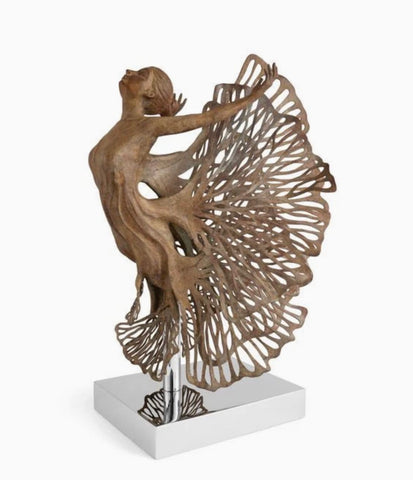 Handcrafted in a limited edition of 50, the Ginkgo Fairy Tabletop Sculpture captures the ethereal beauty of transformation and nature. Sculpted in painted brass and stainless steel, each piece is a one-of-a-kind expression of joy and harmony, with fluttering ginkgo leaves and an elegant figure poised in flight. Measures 14.5"L x 10.5"W x 19.75"H.
