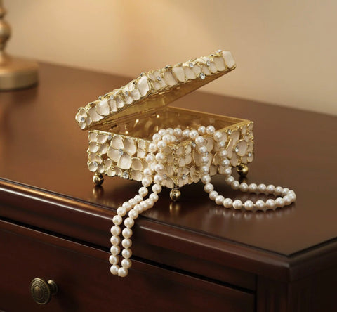 Delicate dogwood blossoms richly cast in a gold finished pewter box with intricate ivory hued hand-enameling and hand-set clear European crystals. Champagne hued moiré silk interior. Tarnish resistant. Signature luxury gift box included.