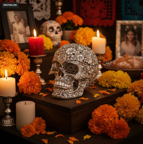 Silver finished pewter garden floral patterned skull box, adorned with hand-set clear European crystals. Hand-enameled base interior. Hinged lid. Tarnish resistant. Signature luxury gift box included.