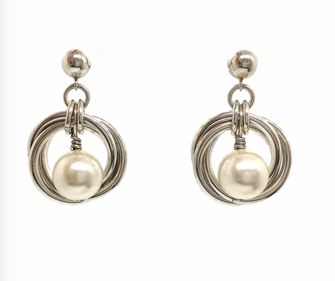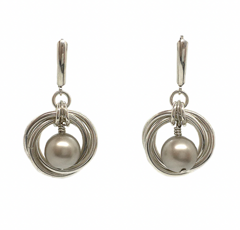 Sterling silver and Swarovski crystal pearls.  Available in post, french back or huggie tops. Available in cream, platinum, gray, or dark gray Swarovski pearls.