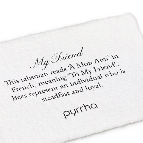 This talisman reads 'A Mon Ami' in French, meaning 'To my Friend'. Bees represent an individual who is steadfast and loyal.