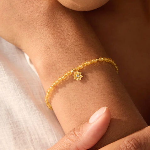Your place in the Universe is unique and precious, a gift to all who are blessed to bask in your light. A gemstone bracelet of citrine—November’s birthstone and the stone of radiance, happiness, and love—shines with an 18kt gold plated lotus flower, an ancient symbol of new beginnings. A brilliant white topaz in the center of the lotus celebrates your individuality—a wearable reminder that you are radiant, powerful, and capable of overcoming challenges to bloom to your full potential.
