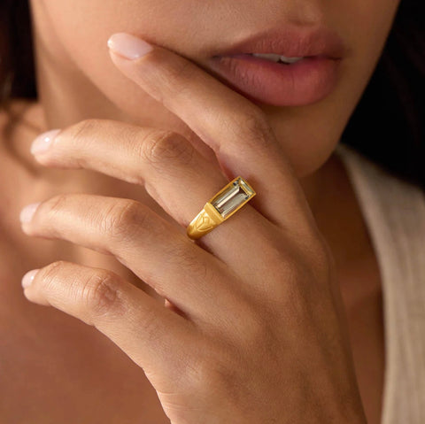 Like a lotus flower arising from the mud, we take our cue from nature, allowing ourselves to bloom fully into our beauty and splendor. An 18kt gold plated ring shines with a brilliant faceted green amethyst, stone of emotional balance, self-assurance, and prosperity. An engraved lotus flanks the green amethyst, symbolizing new beginnings and full potential. Eye-catching enough to be worn alone, this gemstone ring can also be worn with other rings for a personalized look that empowers your journey.