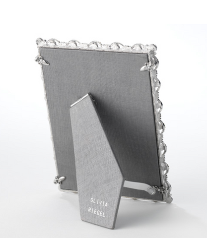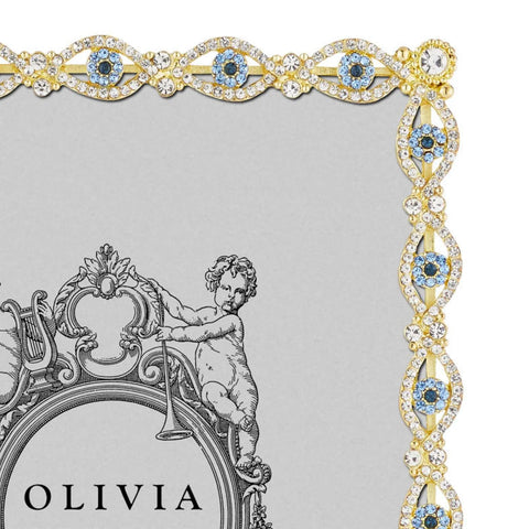 The Evil Eye Frame by Olivia Riegel is cast pewter with hundreds of hand-set clear and light sapphire European crystals. This frame has a grey moiré silk back and beveled glass and is designed for vertical or horizontal placement.