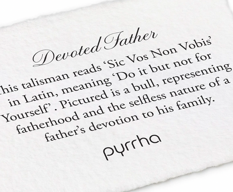 This talisman reads 'Sic Vos Non Vobis' in Latin, meaning 'Do it but not for Yourself'. Pictured is a bull, representing fatherhood and the selfless nature of a father's devotion to his family.