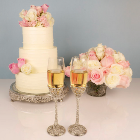 The Silver Isadora Flutes by Olivia Riegel feature contemporary intricate silver finished pewter branch patterned stems adorned with hand-set clear European crystals. Hand Wash.